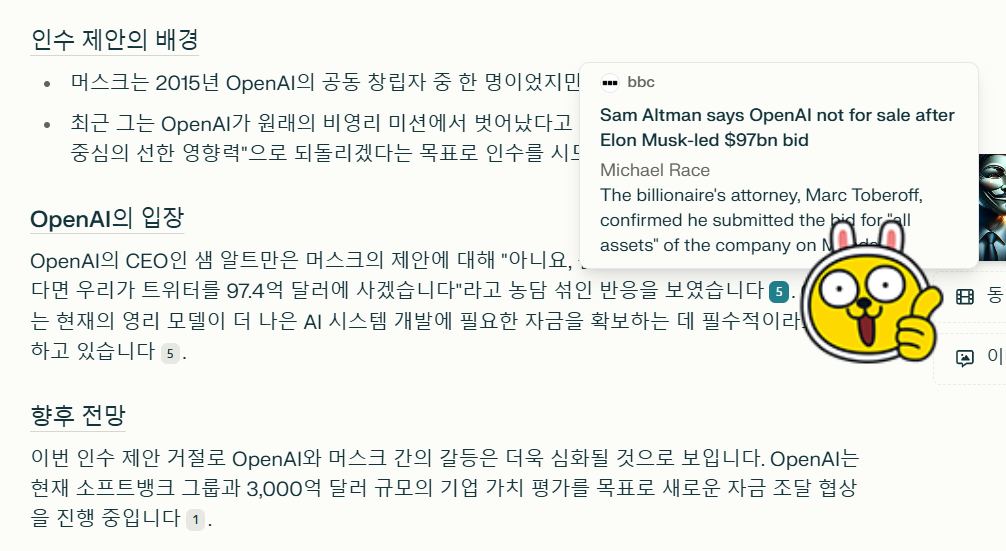 제가 OpenAI의 입장 내용에서 5번 버튼을 눌러봤더니 BBC 기사로 연결되더라구요. 출처도 신뢰도가 높은 곳을 우선으로 선택하는 것 같아서 믿음직스러웠어요!