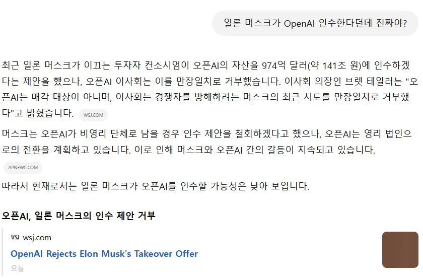 "일론 머스크가 OpenAI 인수한다던데 진짜야?"라고 물어봤어요.